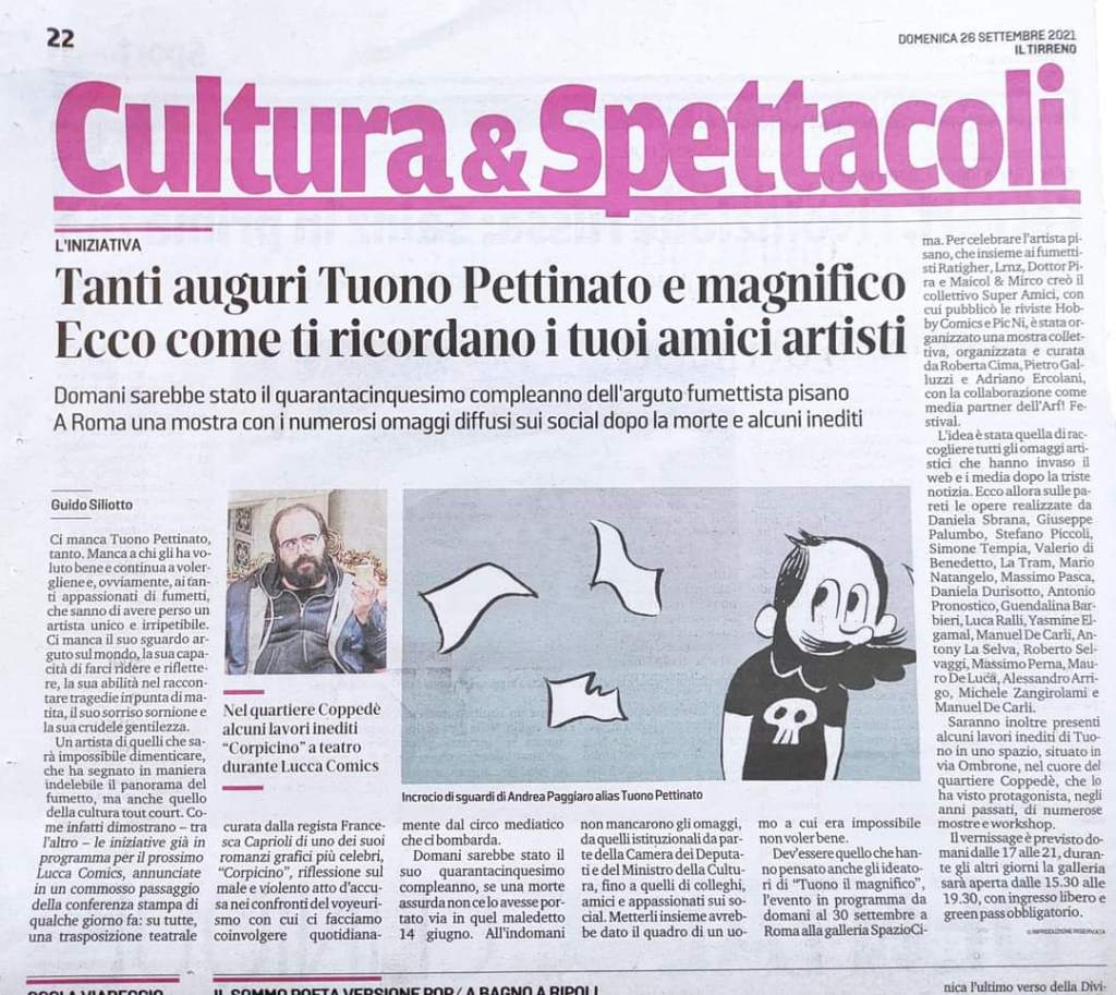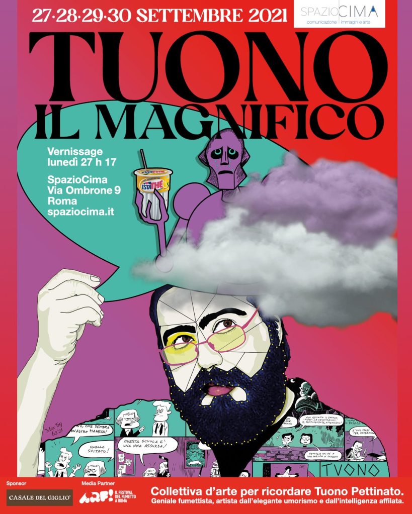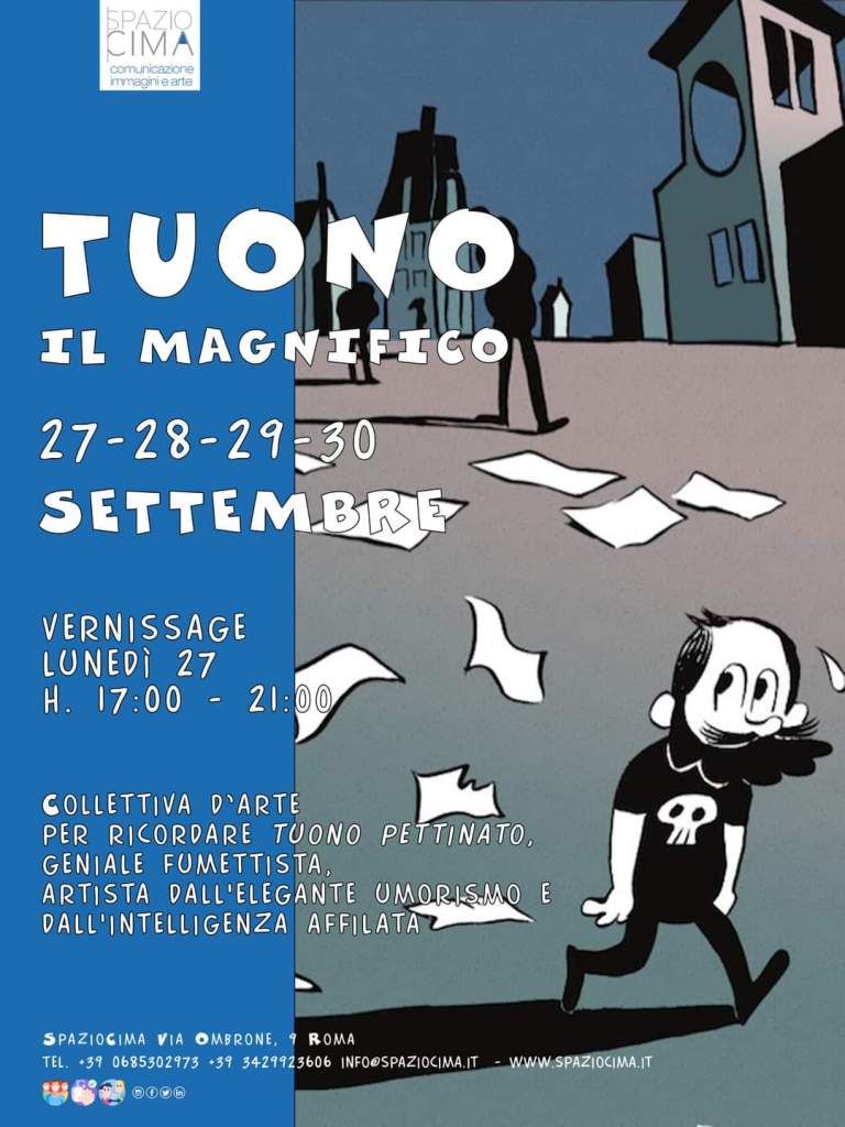Lunedì 27 settembre, in occasione di quello che sarebbe dovuto essere il suo 45esimo compleanno, inaugura presso la Galleria SpazioCima di Roma la mostra collettiva “Tuono il magnifico”. Circa venti artisti che ricordano, con la loro arte e con il loro affetto, Tuono Pettinato, uno degli artisti più geniali degli ultimi anni. Lo spazio, nel cuore del quartiere Coppedè, in cui l’artista pisano è stato protagonista di numerose mostre e workshop, ospiterà fino al 30 settembre una mostra-evento che raccoglierà tutti i principali omaggi che numerosi esponenti della comunità artistica nazionale ha rivolto alla memoria dell’artista. Saranno, inoltre, presenti alcuni lavori inediti di Tuono.