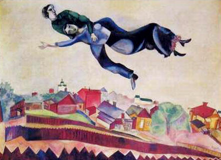 La gran parte della fortuna di Chagall è legata alla rappresentazione dell’amore fluttuante nell’aria, quello tra lui e Bella; un amore sospeso che si distacca dal terreno, fuga dalla realtà quotidiana, sublime e ultraterreno.