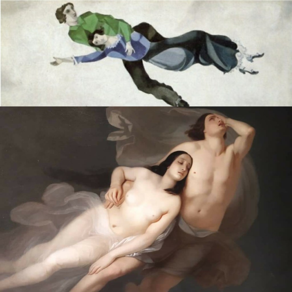 Pochi sanno che, con molta probabilità, l’ispirazione della famosa “icona chagalliana” deriva da un’opera molto meno nota ma non meno poetica il dipinto di Paolo e Francesca di Giuseppe Frascheri,