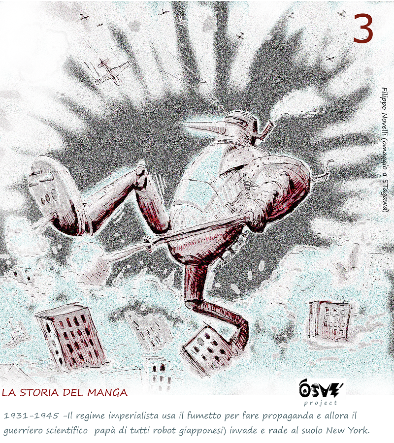 L’ingerenza dell’Occidente unita alle mire imperialistiche nipponiche sull’area dell’Estremo Oriente (invasione della Manciuria) fecero si che il Giappone entrasse in guerra con mezzo mondo. Anche la stampa illustrata si allineo’ alla propaganda di regime. E’ in questo periodo che dalla penna di Tagawa nacque il papà di Goldrake e tutti gli altri robot giapponesi. Ovviamente il guerriero scientifico, così si chiamavano allora, pensò bene di invadere l’America e di mettere a ferro e fuoco New York.